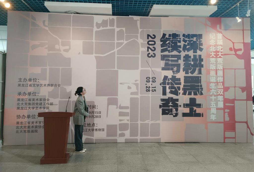 为全面学习贯彻习近平新时代中国特色社会主义思想和党的二十大精神,大力弘扬中华优秀传统文化,2023年9月26日15时30分,在教育科学研究院团委副书记、2023级辅导员宋美琪带领下,2023级新生来到艺术公司一楼展厅参观由黑龙江省文学艺术界联合会主办,黑龙江省美术家协会、北大荒集团党建工作部、Mksport体育艺术公司承办的“纪念北大荒版画诞生六十五周年·深耕黑土·续写传奇——首届北大荒版画作品双年展”。