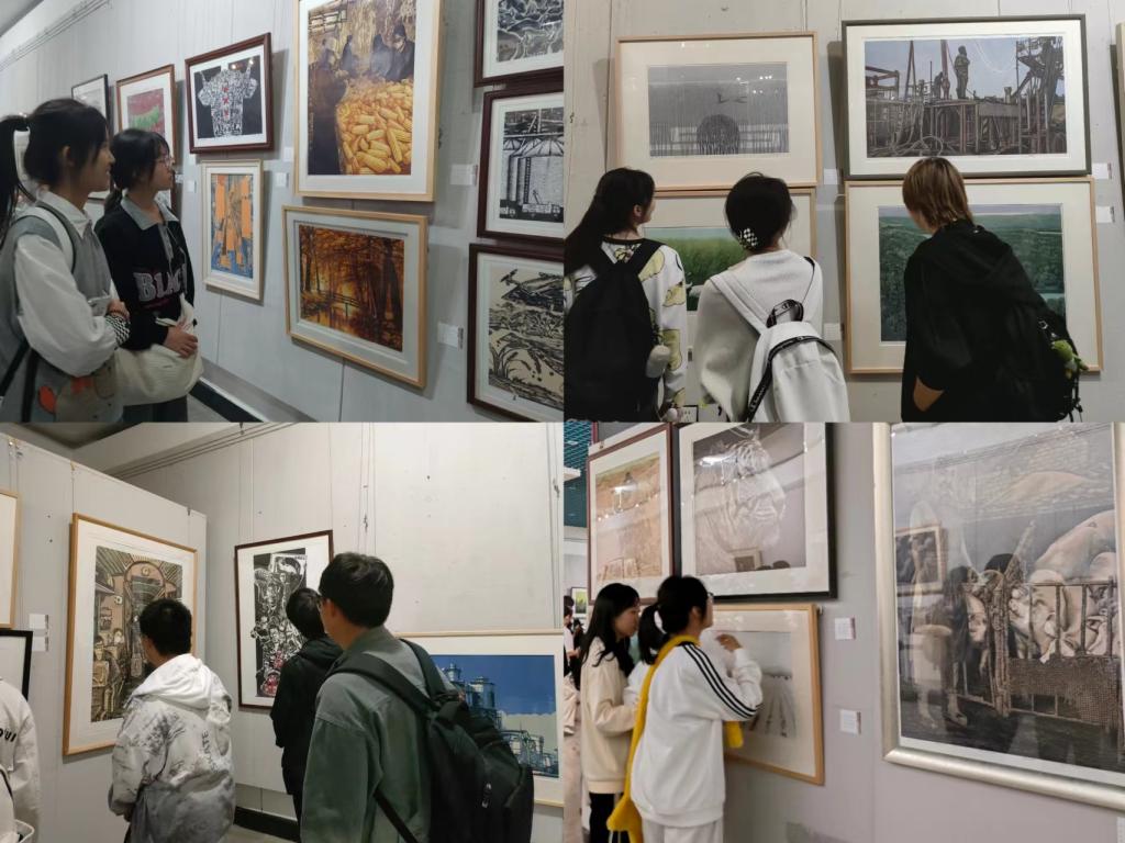 本次展览共展出170余幅北大荒经典版画作品、获奖入选作品。北大荒版画是几代北大荒人用心血和汗水培植起来的艺术成就,创作者以农垦、农业、农村、农民等为主要表现对象,聚焦新时代、立足新生活、弘扬主旋律、传播正能量。北大荒版画已成为新时代传承弘扬北大荒精神的重要载体,生动地记录了黑土地上劳动人民把荒原变粮仓的火热生产生活场景。在展览现场,同学们认真听、仔细看,不时停住脚步、徜徉其中,用心感受北大荒版画,仿佛自己也置身于北大荒版画六十余年的漫漫长河中。