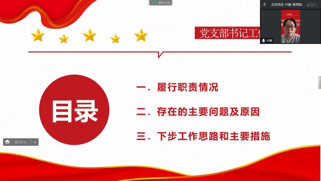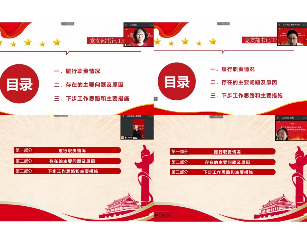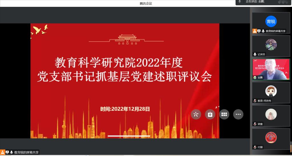 为深入学习贯彻习近平新时代中国特色社会主义思想和党的二十大精神,不断提升基层党建工作质量,根据《关于开展2022年度党组织书记抓基层党建述职评议考核的通知》要求,2022年12月28日下午13时30分,教育科学研究院采取线上形式,召开2022年度党支部书记抓基层党建述职评议会。公司党总支委员、党支部书记及党员代表共12人参与会议,会议由公司党总支书记金鹏主持。
