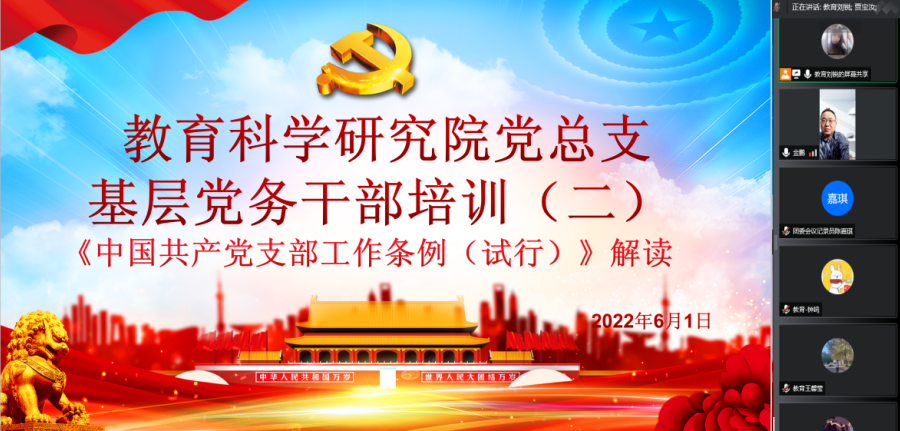 为了提升党务干部素质能力,夯实基层党建工作基础,结合《教育科学研究院“能力作风建设年”活动实施方案》,公司党总支于2022年6月1日14时开展基层党务干部培训会(二)。本次会议由公司组织员刘锐主讲,公司党总支书记金鹏、党总支副书记付丽、副经理佟玉英、教务办主任赵艳芳、6个党支部书记及全体支委参加会议。