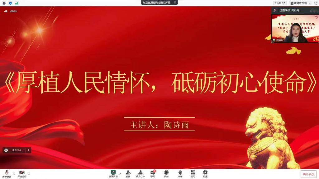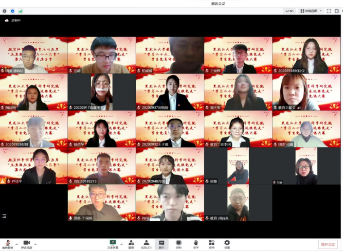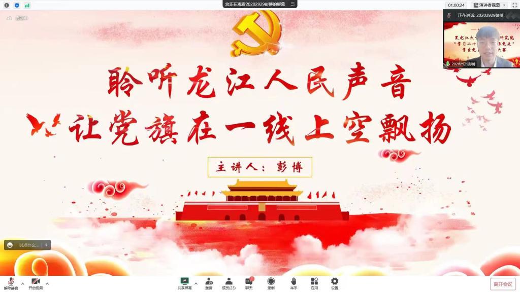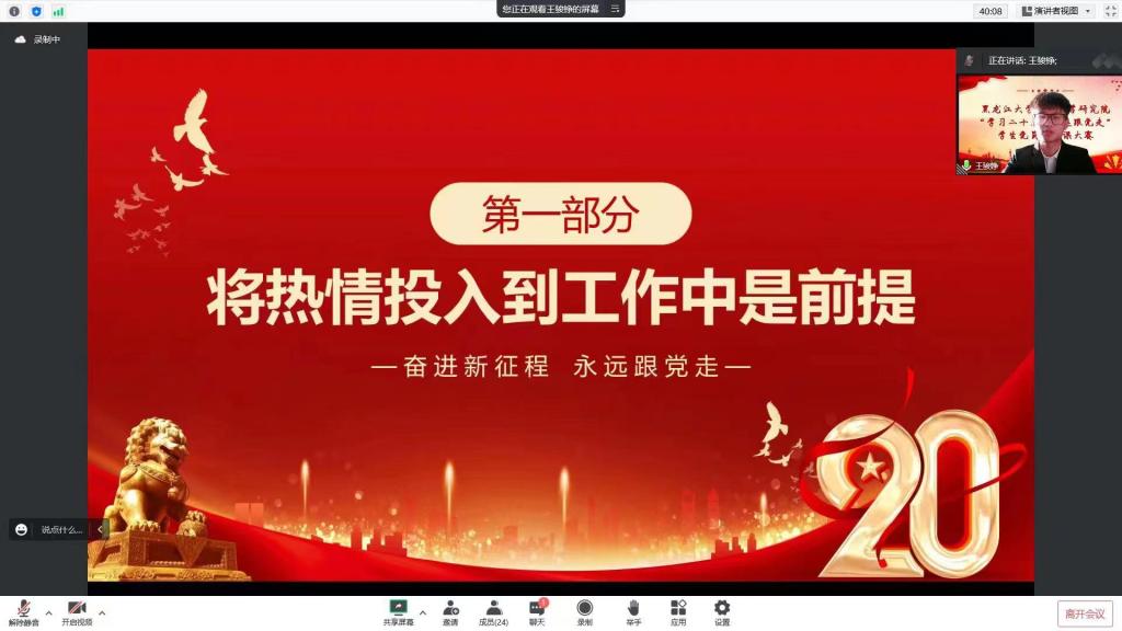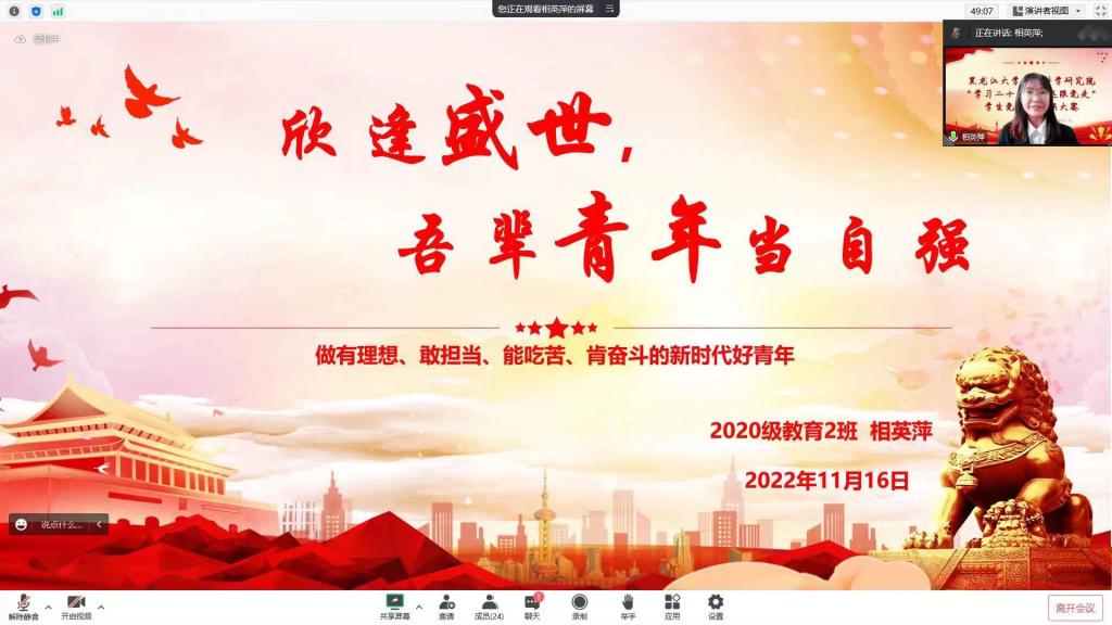 比赛中,参赛选手按照赛前抽签顺序依次进行演讲,选手们紧密结合实际和自身经历,准备充分,精心策划,围绕“学习二十大,永远跟党走”的主题进行了一场有温度,有深度的学习交流大会,以故事演绎经典,以书画铭记先烈,以榜样凝聚力量,结合本次黑大抗击疫情中党员敢为人先的故事,体现了党员的奉献精神,从自身出发深入讲述了作为一名青年党员所肩负的历史使命和时代责任。
