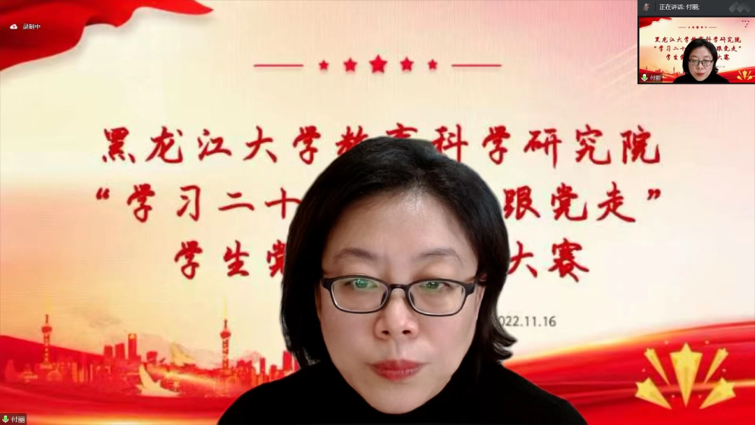 为学习宣传贯彻党的二十大精神,进一步提升党员的政治素养和党性修养,展现员工党员的良好风貌,教育科学研究院于2022年11月16日13时30分在线上举行了“学习二十大,永远跟党走”员工党员讲党课大赛初赛。本次比赛由教育科学研究院团委组织部长于瑞扬主持,教育科学研究公司党总支副书记付丽,院团委书记闵诗尧,院团委副书记梁曼、王馨莹担任评委,全体员工党员参赛。