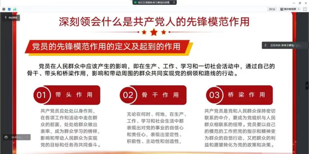 接着,王老师进行理论知识授课,将本次理论部分授课内容分为“深刻领会什么是共产党人的先锋模范作用”、“战疫对党员先锋模范作用要求”、“战疫如何发挥党员先锋模范作用”三个方面。她指出,作为一名员工党员要在全体员工面前发挥好带头作用、桥梁作用、骨干作用,处处以身作则,发挥优势,积极向身边同学做好引导,在疫情防控中找准位置以自己的模范行为带动并影响身边的人。同时要讲政治、讲担当、讲奉献、讲纪律,时刻以一名党员身份去严格要求自己,提高政治站位,争当疫情防控的急先锋、排头兵,充分发挥员工党员在疫情防控中的先锋模范作用。