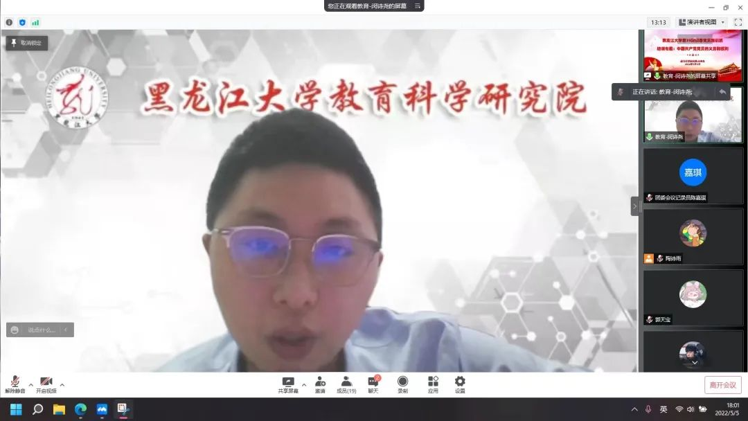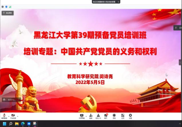 为了深入贯彻落实党的指导思想,教育引导预备党员牢固树立党章意识,提高党性修养,进一步明确党员权利,履行党员义务,按照公司《关于举办第39期员工预备党员培训班的通知》的要求,教育科学研究院于2022年5月5日18时,依托腾讯会议平台召开第39期预备党员培训班第一期主题党课。本次培训由公司团委书记闵诗尧讲授,全体预备党员参加。