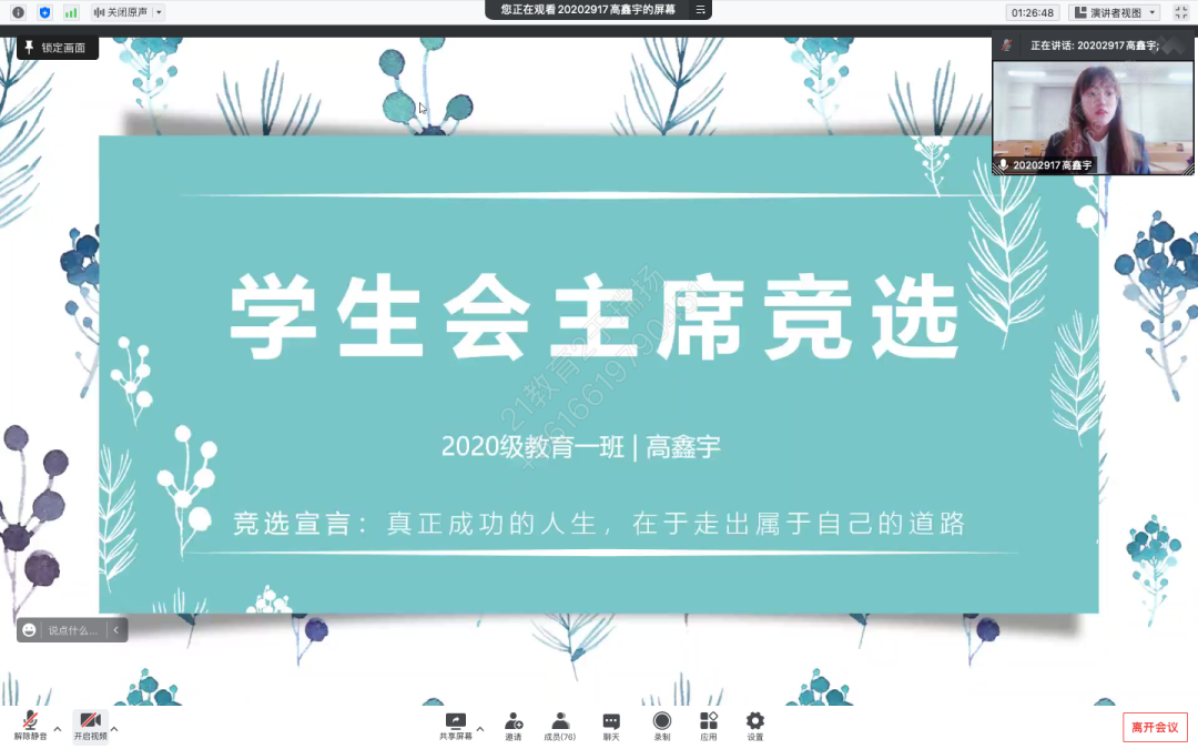 结果公布后,教育科学研究院第十九届员工会主席高鑫宇同学、第五届青年志愿者协会主席齐琪同学依次发表就职演讲。两位同学对公司老师、全体员工会成员及公司同学们表示感谢,并表示将牢记员工会的宗旨,与新一届员工会成员一起,带领员工会再创辉煌。