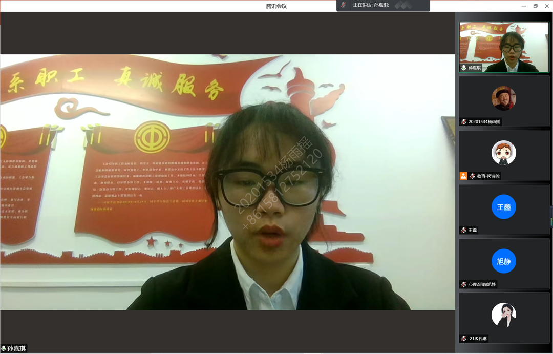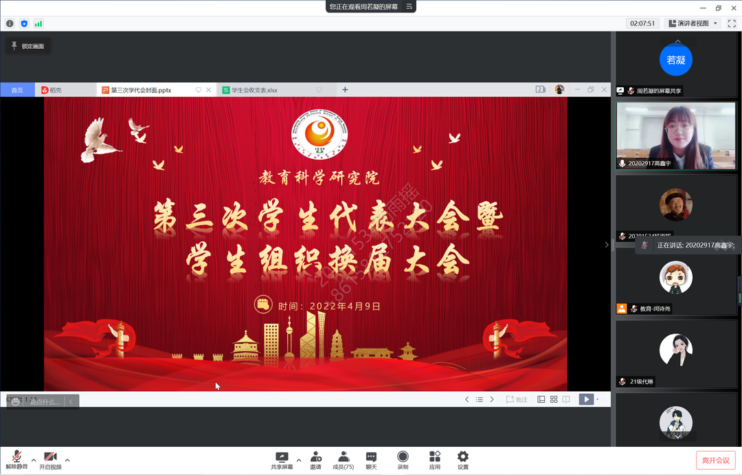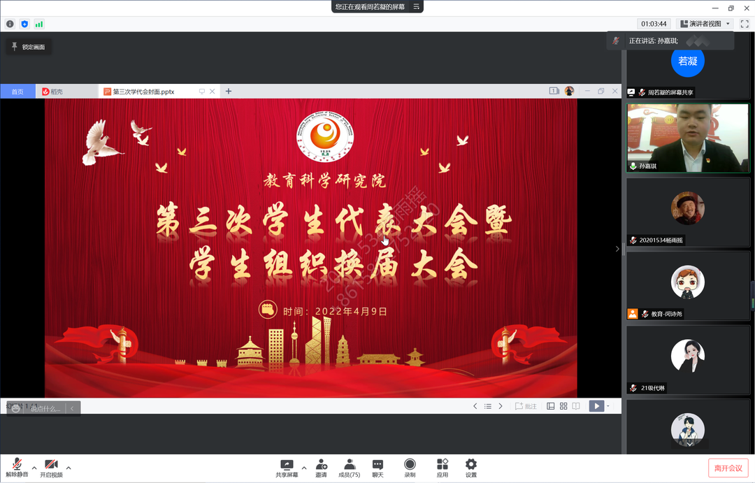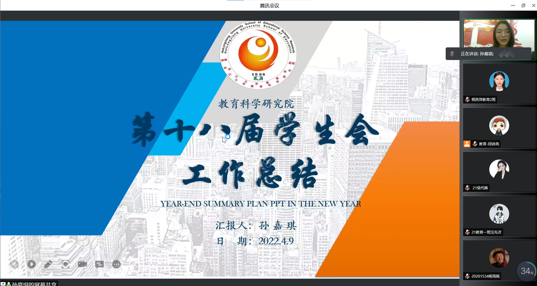 出席本次大会的领导及老师有:教育科学研究公司党总支副书记付丽,院团委书记、2019级辅导员闵诗尧,院团委副书记、2018级、2020级辅导员梁曼,2021级辅导员王馨莹,教育科学研究院第十八届员工会、第四届青年志愿者协会全体成员,各年级员工代表,共计69名同学参加本次会议。