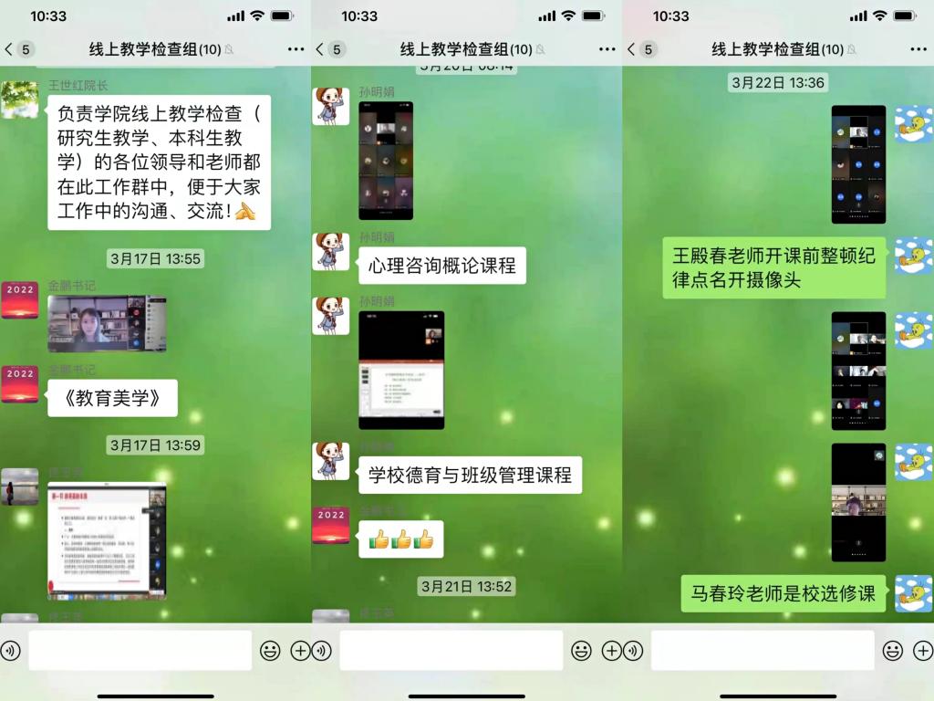网课期间,为了解课堂授课情况、检验员工听课情况,成立线上教学领导组,由院领导班子、系主任、督导,教务员轮流进行线上听课,保证每节课都有人听课,听教师上课状态,查员工出勤,查员工听课效果,公司领导与老师们在线上持续深入课堂听课调研,及时调整措施,切实提升网课课堂教学质量;开学以来进行两轮全覆盖查寝,线下走访员工寝室,了解员工在寝室内的真实学习状态,及时发现、解决同学们学习、生活、心理等方面遇到的问题,帮助同学们以良好的精神状态和积极乐观的心态度过特殊时期。公司的老师们尽心、尽力、尽情守护每一位教育学子的身心健康,用实际行动成为员工思政教育的“活教材”,在抗疫大考中交出专属教育公司的满分答卷。