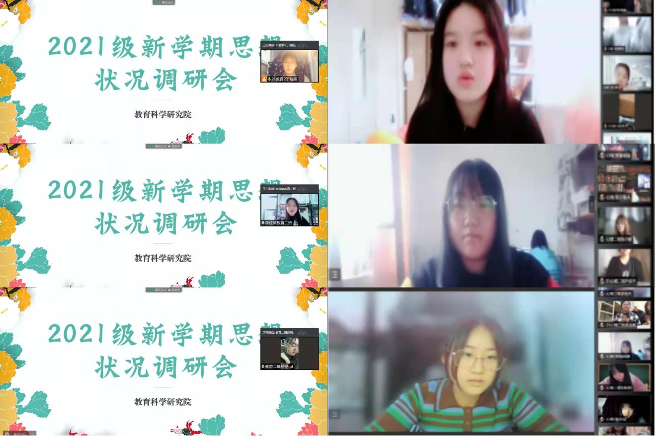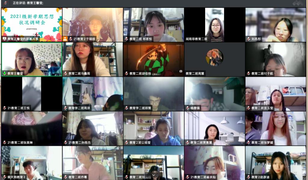 为进一步做好老员工思想教育工作,全面客观掌握新学期公司员工思想状况,了解其个人理想信念和对社会热点问题的关注,进一步制定、调整思想政治教育路线,帮助员工树立正确的价值观念,以正确的价值导向作为行动指南。2022年3月18日教育科学研究院在腾讯会议平台上开展2021级新学期思想状况调研会。本次调研会由2021级辅导员王馨莹老师主持,2021级教育2班、心理2班全体同学参会。