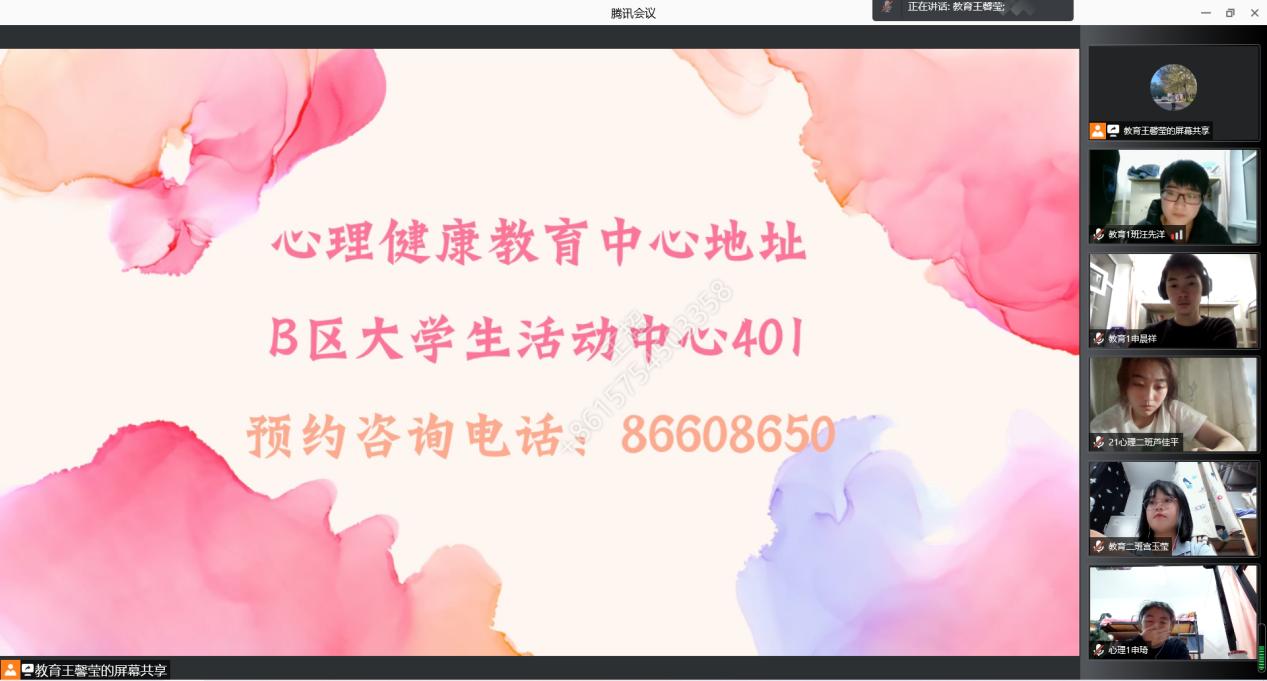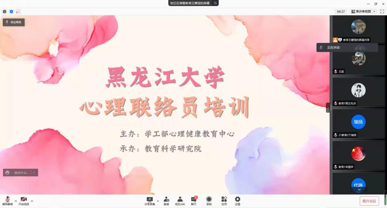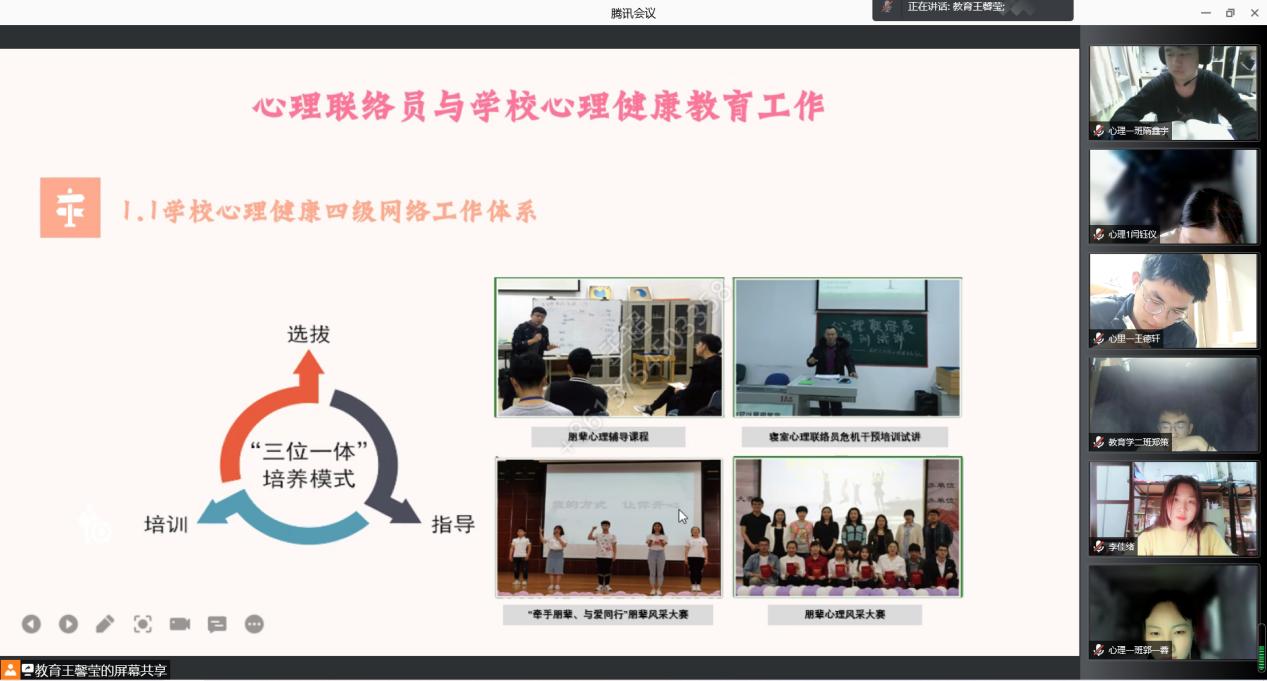 为进一步推动老员工心理健康教育,提升员工进行心理服务的专业性,教育科学研究院于2021年11月9日18时通过腾讯会议召开线上心理联络员培训会,本次会议由2021级辅导员王馨莹老师主持,2021级全体心理联络员参会。
