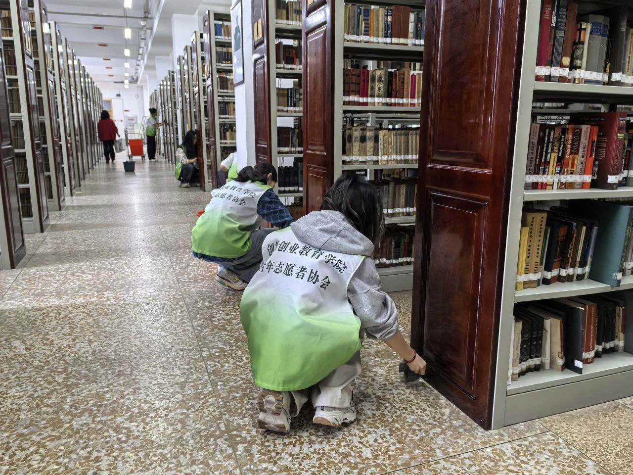 活动开始前,负责人详细阐述了本次活动的流程与重点任务。分工完成后,志愿者们迅速投身到各自的岗位中,拿起清洁工具,对书架进行全面清洁。从顶层的积灰到边角的污渍,志愿者一丝不苟地清理,不放过任何一处细节。志愿者们的辛勤付出,赢得了图书馆工作人员的一致好评。他们专注认真的工作态度,充分彰显了青年志愿者的活力与担当。经过大家的共同努力,图书馆的面貌焕然一新,整齐的书架、洁净的环境,让阅读空间更加舒适宜人。