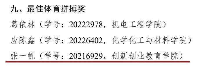 经过材料审核、现场答辩和评审委员会评审,公司2021级教育学专业张一帆同学荣获“最佳体育拼搏奖”荣誉称号。