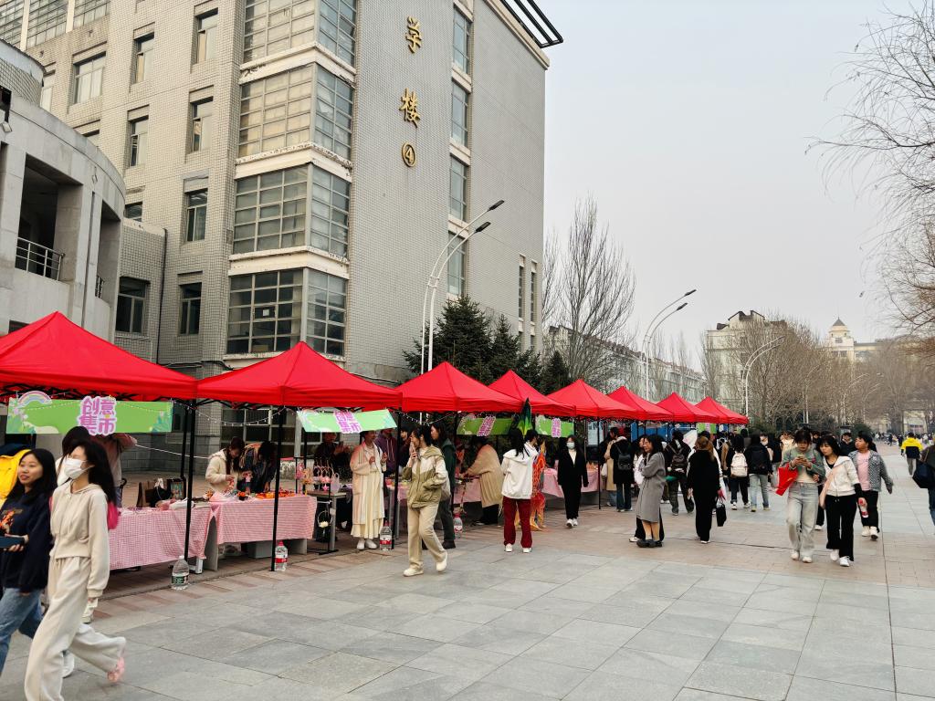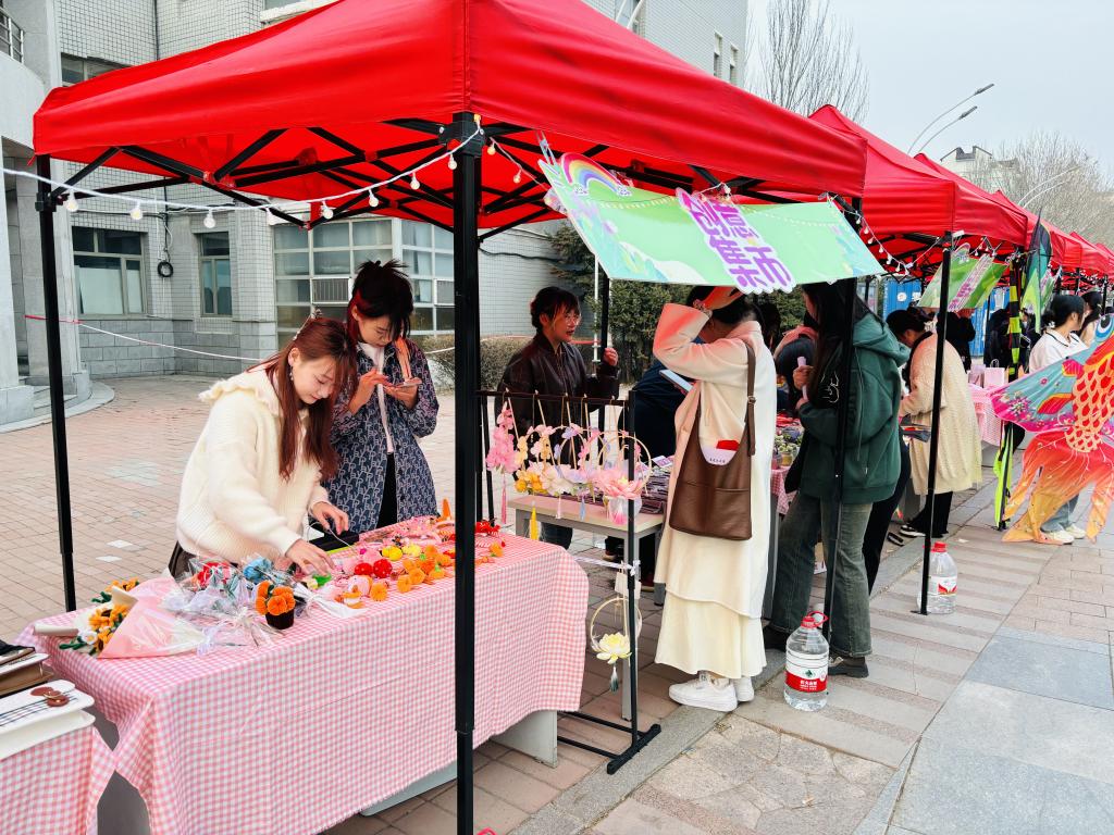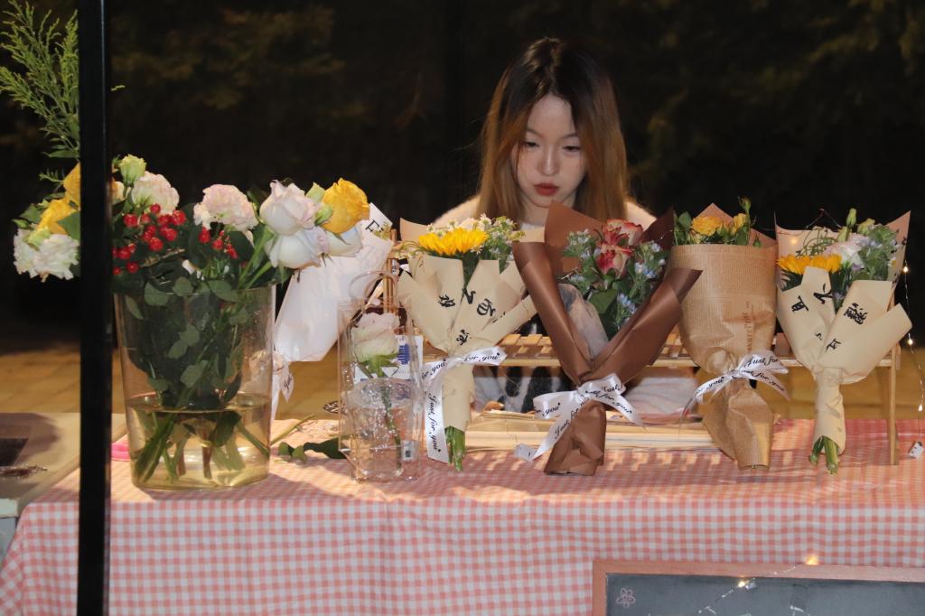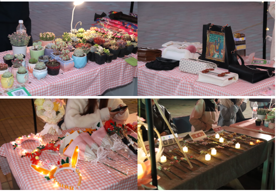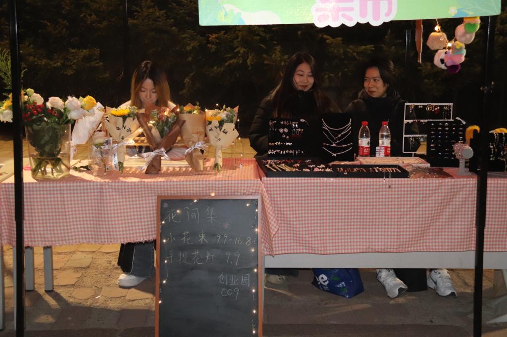 本次创意集市摊位商品丰富多样,有琳琅满目的首饰、精致的手作、可爱的摆件、芬芳的花卉和富含哲理的书籍。这些商品在灯串的映照下镀上了柔和的光晕。天气乍暖还寒,伴随着校园十佳歌手美妙的歌声,同学们热情高涨,创意集市人流如潮。